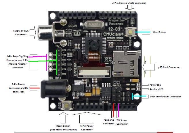 Esta cámara viene preparada para conectar dos servos, uno para movimiento horizontal y otro para movimiento vertical (PAN y TILT). Estos servos los controla la cámara cuando sigue colores de una imagen y hacen que la cámara mire automáticamente hacia esos colores.
